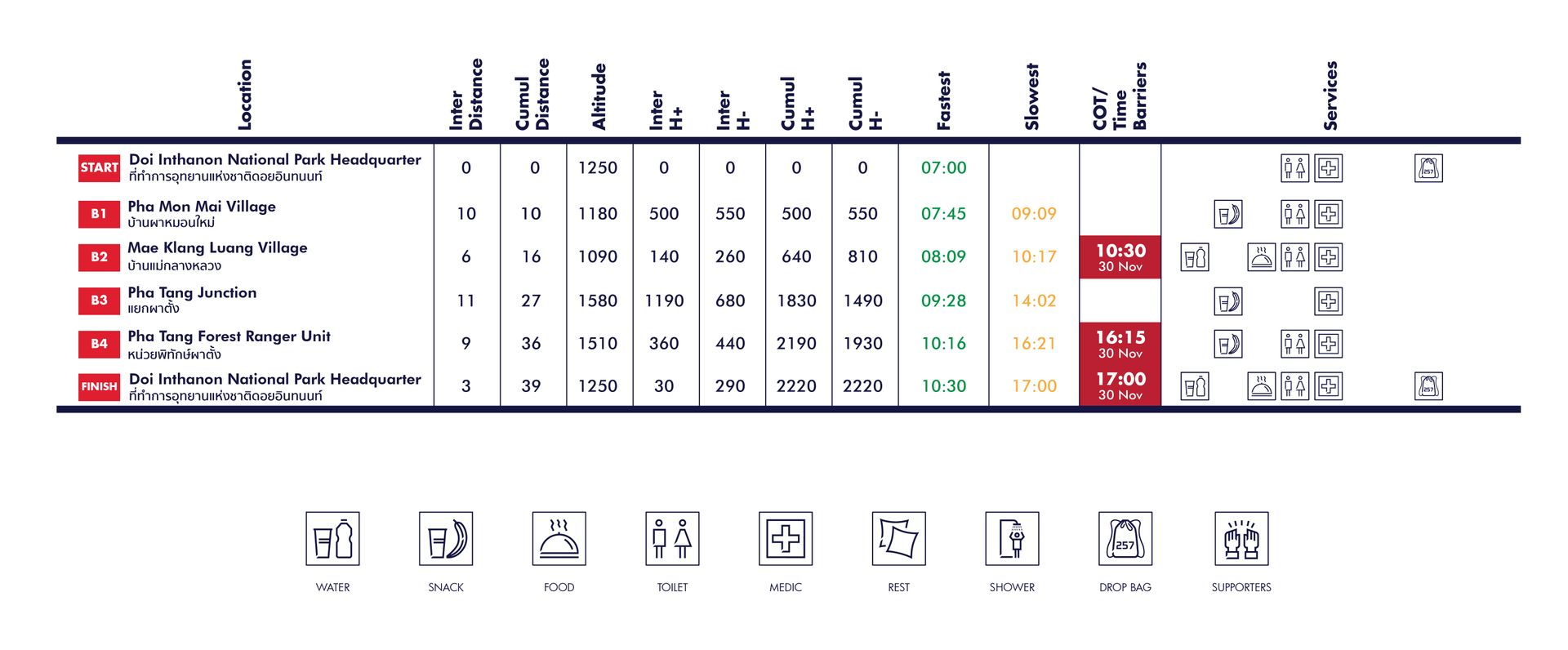 The INTHANON 50 route passes through significant highlights including the Doi Hua Suea and Doi Pha Tang peaks. It is a loop course with the start and finish line at the Doi Inthanon National Park Headquarters.