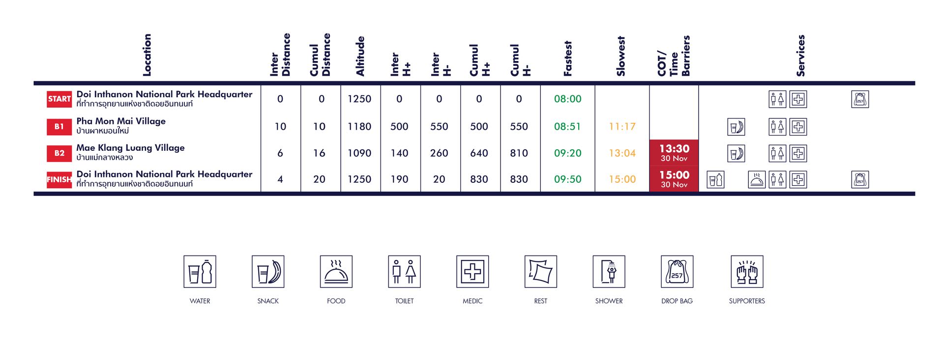 The route passes through the important highlight of Ban Mae Klang Luang rice terraces. It is a loop course with the start and finish line at the Doi Inthanon National Park Headquarters.